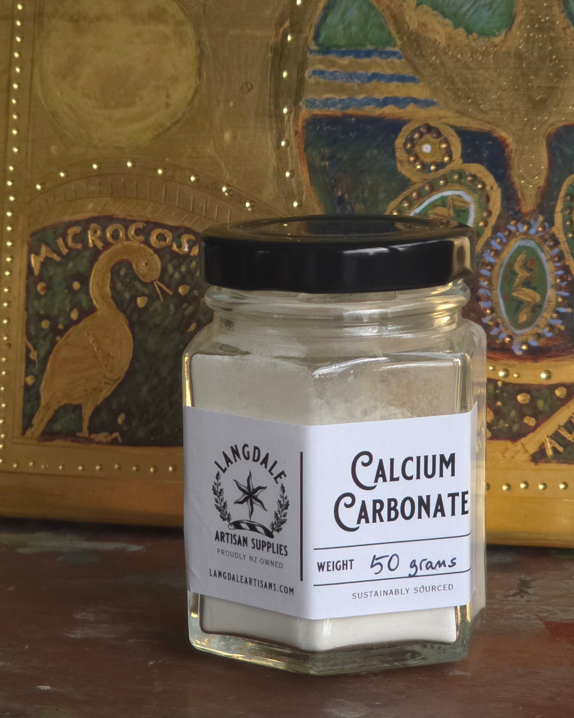 Calcium carbonate is used to prepare traditional gesso wood panels for gilding. When working with natural plant dyes, it is also a common addition to the madder root dye bath to deepen shades and is one of the key minerals that create hard water. It is also used as a post-bath for mordanting cellulose fibres with aluminum acetate.